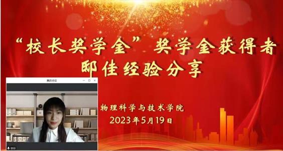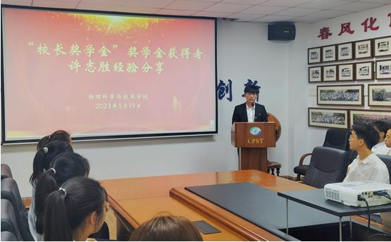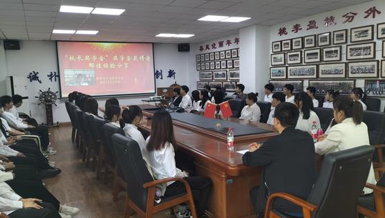 会议伊始,2021-2022“董事长奖学金”获得者、2022年校优秀学习标兵、现已推免至东北师范大学的2019级物理学(师范)专业的许志胜以“如何当好一名员工干部”为题做分享。